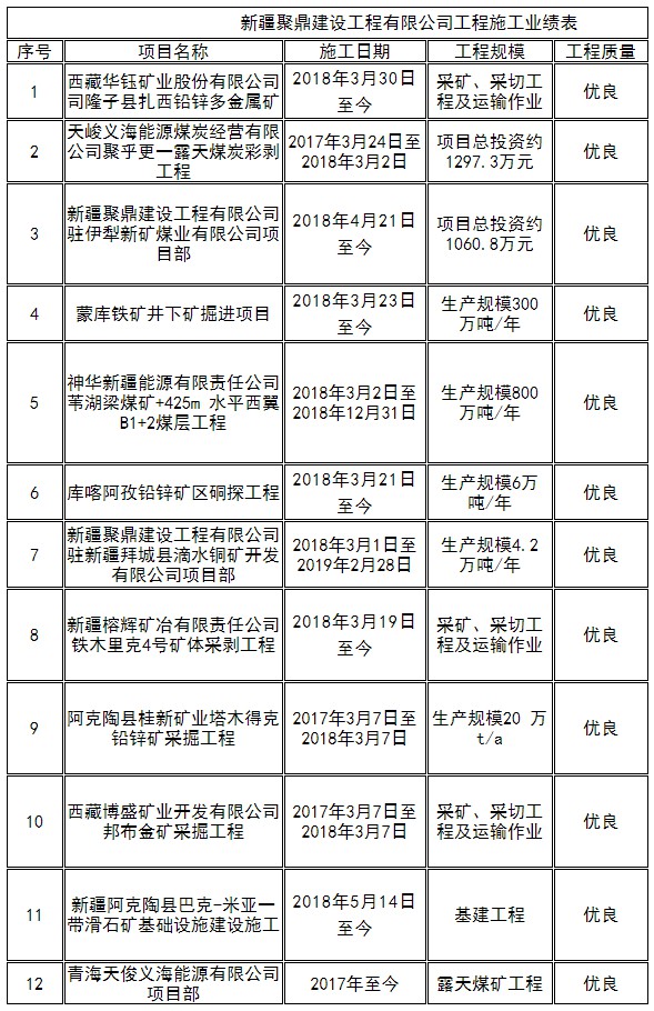 新疆聚鼎建設工程有限公司為國家礦山工程總承包二級企業,創建于2013年,主要從事礦山采掘、隧道開挖、大型土石方爆破、機電設備安裝,水利水電工程,路橋工程等工程施工。